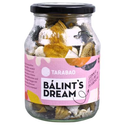 Die Balint's Dream Nussmischung MW von TARABAO BIO.FAIR.DIREKT. bringt eine exotische Geschmacksexplosion in deinen Alltag. Diese vegane Nussmischung vereint aromatische Kokos-Cashews, fruchtige Süßkirschen, knackige Kokos-Smiles, saftige Mango, süße Ananas und zarte Baby-Bananen zu einem unvergleichlichen Snack-Erlebnis. Mit einem Anteil an hochwertigen Zutaten aus kontrolliert biologischem Anbau ist diese Mischung nicht nur lecker, sondern auch frei von Gentechnik. Die Kokos-Cashews sind besonders cremig und verleihen deiner Snackpause eine besondere Note. Sie sind ideal für die Zubereitung von gesunden Müslis, im Joghurt oder einfach pur als Snack für zwischendurch. Die fruchtigen Komponenten wie Mango und Ananas bringen eine erfrischende Süße mit sich, die perfekt zu einem fruchtigen Frühstück oder als Topping für Desserts passt. Verwende die Nussmischung auch als kreatives Element in deinen Backkreationen – ein beliebter Tipp ist, die Mischung in Muffinteige zu integrieren oder als Füllung für Energy Balls zu nutzen. Die Balint's Dream Nussmischung ist in einer umweltfreundlichen Mehrwegverpackung erhältlich, was sie zu einer nachhaltigen Wahl macht. Achte darauf, die Mischung kühl und trocken zu lagern, um die Frische und den Geschmack zu bewahren. Ideal für unterwegs, beim Sport oder im Büro, sorgt sie dafür, dass du jederzeit einen gesunden Energieschub zur Hand hast. Wenn du auf der Suche nach einem Snack bist, der nicht nur gut schmeckt, sondern auch gut für die Umwelt ist, ist die Balint's Dream Nussmischung die richtige Wahl. Probiere sie aus und finde heraus, wie vielseitig dieser gesunde Snack sein kann!