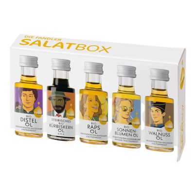 Die Fandler Salatbox vereint fünf exquisite Öle, die deine Salate auf ein neues Geschmacksniveau heben. Jedes Öl – Distel-, Kürbiskern-, Raps-, Sonnenblumen- und Walnussöl – bringt sein eigenes, einzigartiges Aroma mit und bietet dir die Möglichkeit, kreativ zu werden. Die Öle sind nicht nur geschmacklich vielfältig, sondern auch von höchster Qualität, denn sie sind ohne Gentechnik hergestellt.